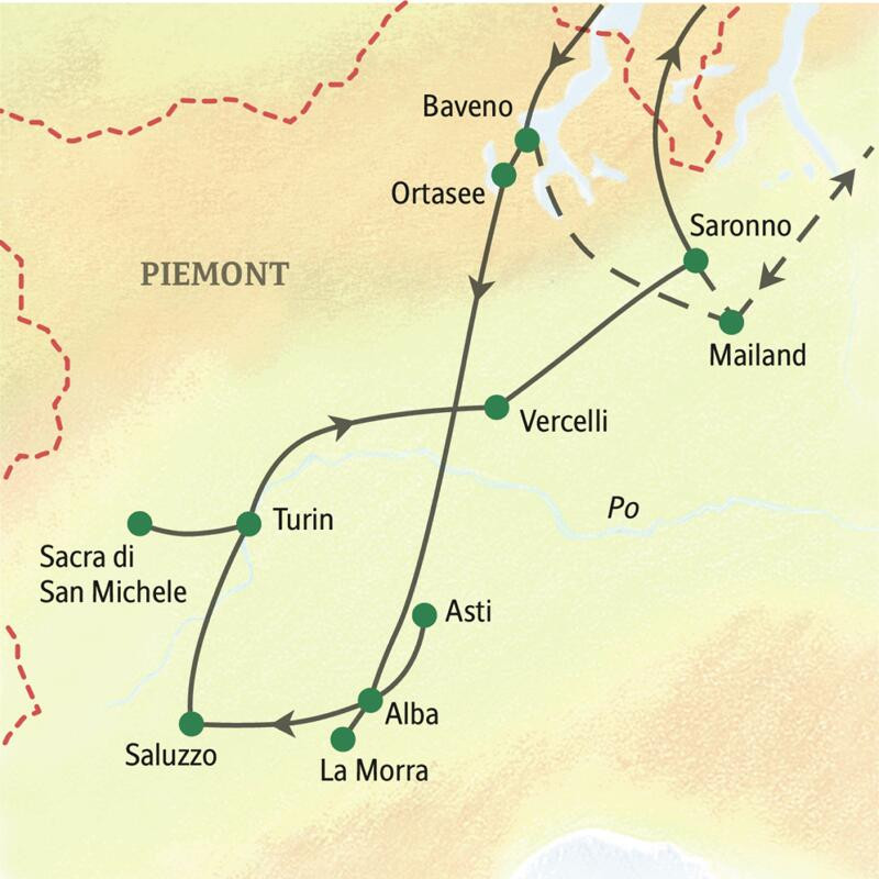 Am Fuße der Berge, so der Name Piemont, liegt der Gipfel des Genusses. Unsere Rundreise macht schon den Weg zum Ziel: Alle Sinne auf Empfang für die blühenden Inseln im Lago Maggiore und die Idylle am Ortasee! Und erst recht, wenn wir in Asti mit einem Winzer über seine edlen Tropfen fachsimpeln, auf Trüffelsuche mit einem Tartufaio gehen, in die samtige Welt des Barolos eintauchen und das vielleicht cremigste Risotto Italiens kosten. Wir bewundern die Geschlechtertürme in Alba, das Castello della Manta bei Saluzzo, die barocke Perle Turin, die auch vor Motoröl und Autolack glänzt, und die tollkühn auf ihrem Berggipfel balancierende Abtei Sacra di San Michele – Wahrzeichen Piemonts und krönender Abschluss unserer Reise.