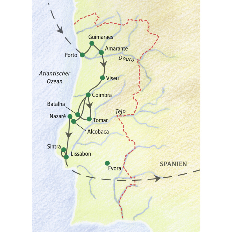 - 9 Übernachtungen im Doppelzimmer, Hotels mit Klimaanlage, in Coimbra auch mit Swimmingpool