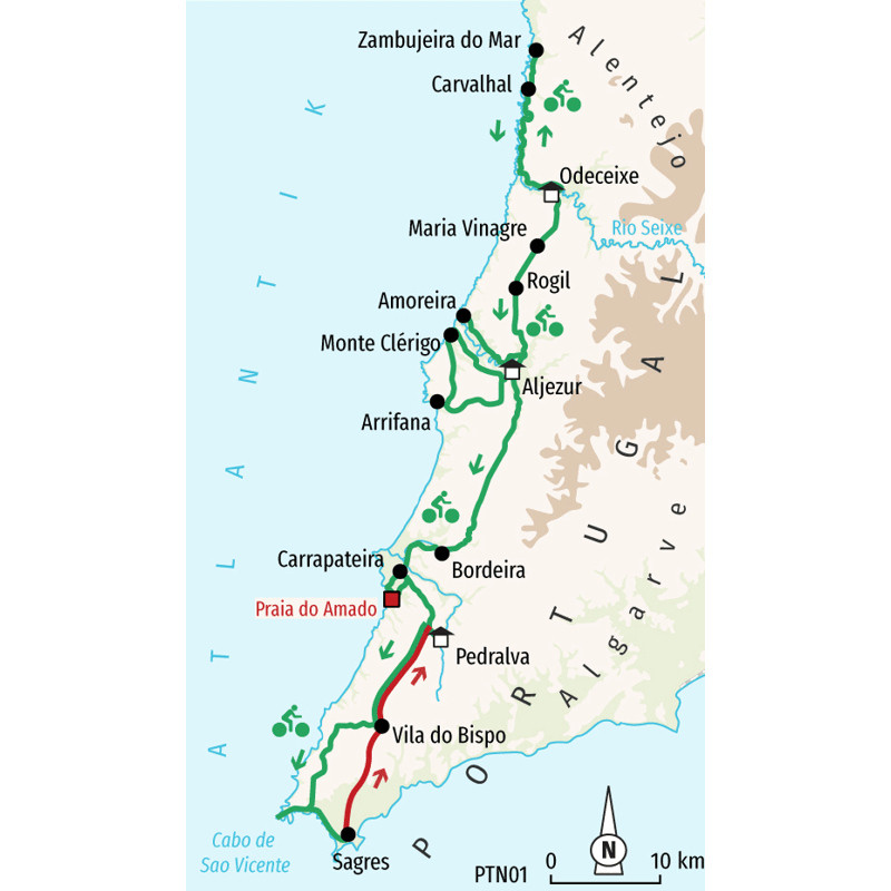 MTB oder E-MTB Reise durch Algarve und AlentejoAuf dieser selbst geführten Radreise folgen wir Portugals wunderschöner Küste vom Alentejo bis zur Algarve. Unsere Route beginnt in Odeceixe und führt nach Cabo Sao Vicente, dem südwestlichsten Punkt Portugals und Kontinentaleuropas. Wir radeln im Gelände durch den Naturpark "Sudoeste Alentejano e Costa Vicentina" und folgen der Route der Rota Vicentina entlang blumiger Felder, wunderschöner Klippen und wilder Strände von Dorf zu Dorf. Genießen Sie unterwegs köstliches lokales Essen und hervorragenden Wein.Wir lassen Sie auf eigene Faust losziehen - mit unseren sorgfältig ausgearbeiteten Selfguided-Touren reisen Sie in Ihrem eigenen Tempo. Ganz gleich, ob Sie alleine, als Paar, als Familie oder mit einer Gruppe von Freunden reisen – Sie müssen sich um nichts kümmern. Genießen Sie eine perfekte Kombination aus Unabhängigkeit und einer durchdachten Reiseorganisation im Hintergrund. Die Reservierung von Unterkünften, den Gepäcktransport und, falls nötig, die Transfers zum Startpunkten der Radetappen erledigen wir für Sie. Auf Wunsch unterbreiten wir Ihnen auch gerne ein Flugangebot.Herzstück der Touren ist das Roadbook und die vor der Abreise zur Verfügung gestellten GPS Daten, die Ihnen neben detaillierten Wegbeschreibungen mit Kartenausschnitten auch Restaurant- und Besichtigungstipps liefern.So finden Sie immer leicht und stressfrei den Weg – Portugal erwartet Sie!
