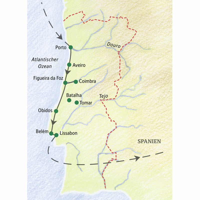 Von Porto bis Lissabon – auf dieser Rundreise entdecken Sie die kontrastreiche Mitte Portugals. Weltklasse-Portwein und spektakuläre, moderne Architektur in Porto, eine Bootsfahrt auf dem Douro, die bunten Kacheln an Häusern und Palästen. Süße Melancholie verströmen die Fado-Gesänge, die uns Musiker in Coimbra schenken. Wir besuchen die älteste Universitätsbibliothek Portugals, wo sich literarische Schätze und barocke Opulenz begegnen, erleben die bemalten Gondeln in Aveiro, die bizarre Schönheit des Hieronymusklosters und den Herzschlag von Lissabon, das wir alltagsnah zu Fuß und per Metro durchstreifen. Zwischendurch genießen Sie drei herrliche Tage am Atlantik und viel Zeit für eigene Unternehmungen.