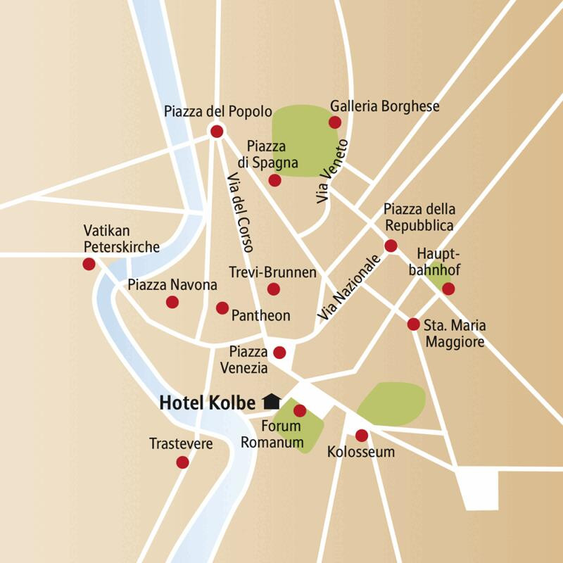 Hotel Kolbe****Das stilvolle Hotel befindet sich in einem ehemaligen Konvent, in dem der heiliggesprochene Pater Maximilian Kolbe gelebt hat. Sie wohnen direkt im Zentrum des antiken Rom, zu Füßen von Kapitol und Palatin. In wenigen Gehminuten erreichen Sie den Circus Maximus, die Altstadt und das beliebte Viertel Trastevere auf der anderen Seite des Tibers. Die Einrichtung verbindet die Atmosphäre des historischen Gebäudes mit modernem Design. Die Zimmer verfügen über Klimaanlage, Sat.-TV, kostenfreies WLAN, Minibar, Safe und Föhn. Das Restaurant öffnet sich zur Gartenterrasse, wo Sie mit Blick in den Hotelgarten frühstücken können oder abends den Tag mit einem Getränk von der Bar oder beim Abendessen ausklingen lassen können.