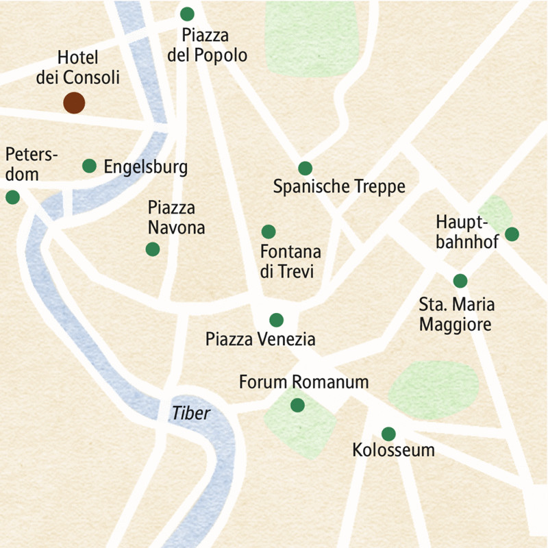 Hotel dei Consoli***(*)Im eleganten Viertel Prati, ganz in der Nähe des Vatikans und gut sortierter Einkaufsstraßen, befindet sich dieses familiengeführte Hotel. Mit nur 28 Zimmern verfügt es über eine sehr private Atmosphäre. Schmuckstück des Hotels ist die Dachterrasse, von der Sie - inmitten von Zitrus- und Olivenbäumchen - einen tollen Blick haben. Eine kleine Oase über den Dächern der Großstadt! Auch das Frühstück wird dort serviert. Die etwas kleinen Zimmer sind mit Klimaanlage, Sat.-TV, WLAN (kostenfrei), Minibar, Safe und Föhn ausgestattet.