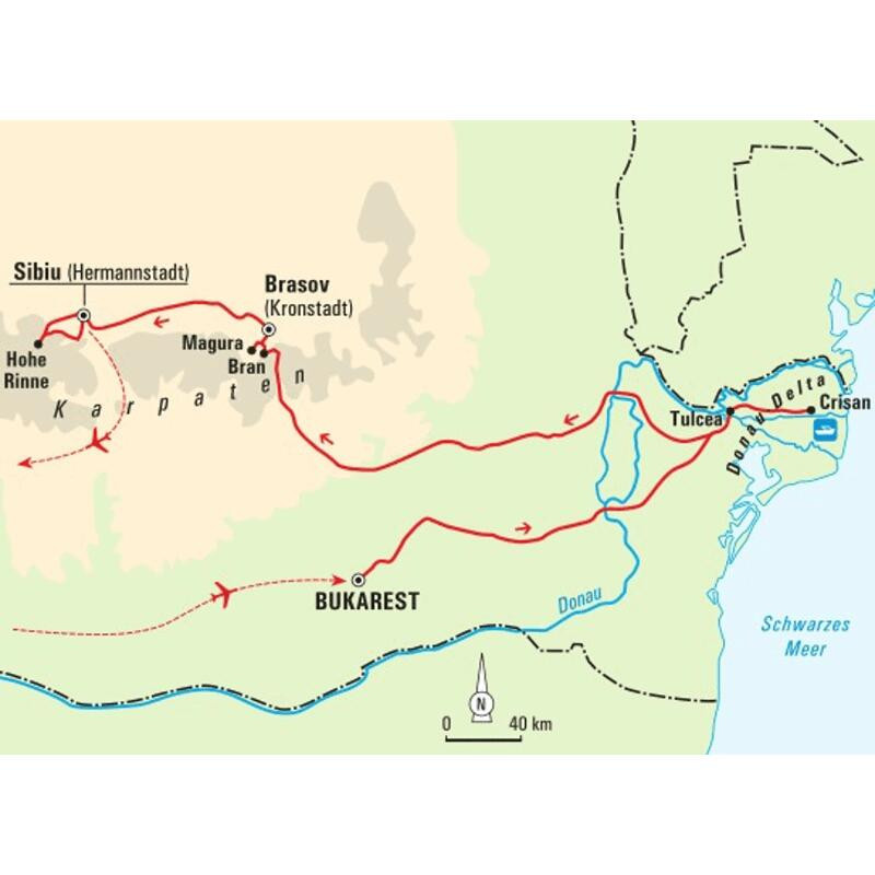 Wanderreise in Siebenbürgen mit Kanufahrten durch das DonaudeltaFast lautlos gleitet unser Kanu durch den von unzähligen Seerosen bedeckten Flussarm. Frösche hüpfen erschrocken ins Wasser und unterbrechen ihr Konzert, Pelikane kreisen über dem Schilf und halten Ausschau nach Nahrung. Geräuschlos nähern wir uns mit dem Kanu den nistenden Vogelkolonien, wir gleiten auf den Wasserarmen weiter ins Delta hinein und beobachten die Fischer beim Angeln. Wie kleine Inseln liegen die kleinen Dörfer in einem Meer aus Wasser und Schilf und inmitten dieser Naturidylle beziehen auch wir Quartier in familiären Gästehäusern. Eine schnatternde Gänsefamilie watschelt durchs Dorf, ein Pferdefuhrwerk biegt um die Ecke – die Zeit scheint stehen geblieben zu sein. Aber wir nicht: Nachdem wir die Kanäle der Donau erpaddelt haben, geht unsere Reise weiter ins Landesinnere. Wir tauschen in Siebenbürgen das Paddel gegen die Wanderschuhe und erkunden das "Land jenseits der Wälder". Kein Wunder, dass sich Graf Dracula den dichten Wald Transsilvaniens als Versteck erkoren hat. Wir wandern zum sagenumwobenen Schloss Bran, queren den Bergrücken zum höchstgelegenen Kurort Rumäniens und folgen den Hirtenpfaden im Cindrel-Gebirge. Wir bummeln durch das mittelalterliche Sibiu, kehren in urigen Sennhütten ein und besuchen eine Bauernfamilie in Michelsberg zum Abendessen. Dabei lernen wir nicht nur die herzhafte siebenbürgische Küche kennen, sondern auch das Leben der Menschen. Das Donaudelta und die Karpaten könnten kaum unterschiedlicher sein, aber beide Regionen begeistern – Rumänien steckt voller Gegensätze!