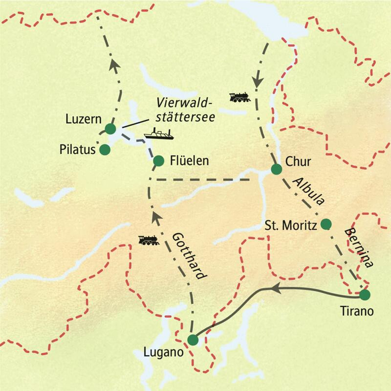 Wir haben die Weichen für eine besondere Reise gestellt, bei der Sie nur mit öffentlichen Verkehrsmitteln auf den schönsten Strecken unterwegs sind: Schlängeln Sie sich mit der Rhätischen Bahn von Chur auf der Albula-Linie hoch bis St. Moritz. Mit dem Bernina Express geht es mit spektakulären Ausblicken hinunter in das italienische Tirano. Und der Gotthard-Panorama-Express bringt Sie von Lugano über die historische Gotthard-Bergstrecke nach Flüelen. Weitere Höhepunkte: eine Schiffsfahrt auf dem Vierwaldstättersee und eine Übernachtung auf dem Pilatus, dem Hausberg von Luzern.