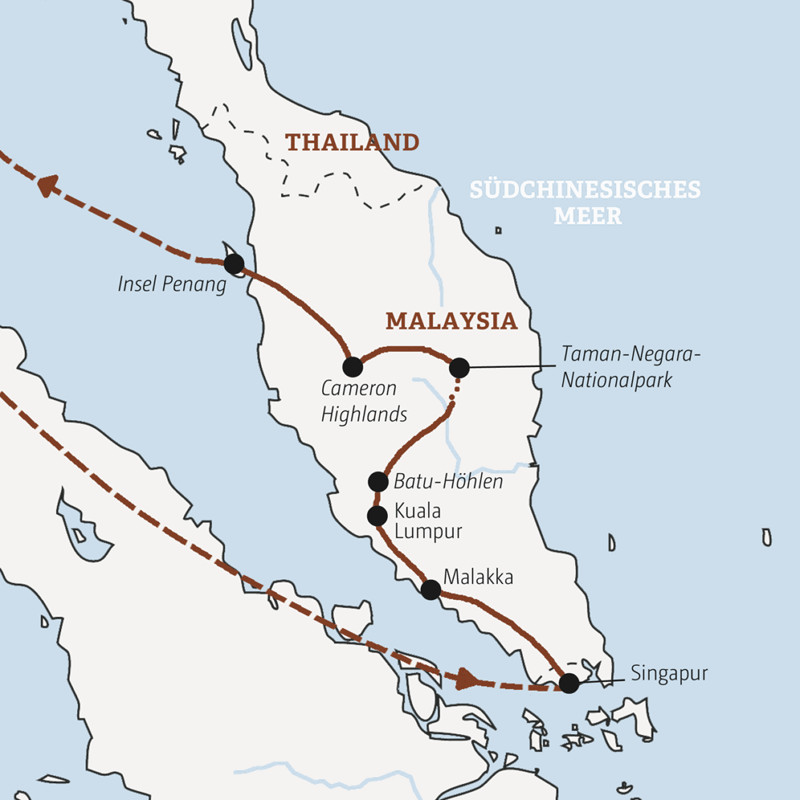 Ihre Tigerkrallen haben die asiatischen Megacitys Singapur und Kuala Lumpur dem Westen längst gezeigt. Doch hinter den Glitzerfassaden findet man immer noch das alte Asien der Tempel, Märkte und Garküchen. Wir erleben Singapur und Malaysia mit dem Langschwanzboot, zu Fuß und authentisch, zum Beispiel bei einer Streetfood-Tour. Kontrastprogramm zu den Metropolen: alte Kolonialstädte, ursprüngliche Dörfer und Natur pur in den teegrünen Cameron Highlands, beim Dschungel-Walk durch den Taman-Negara-Nationalpark oder beim Entschleunigen am Strand von Penang.