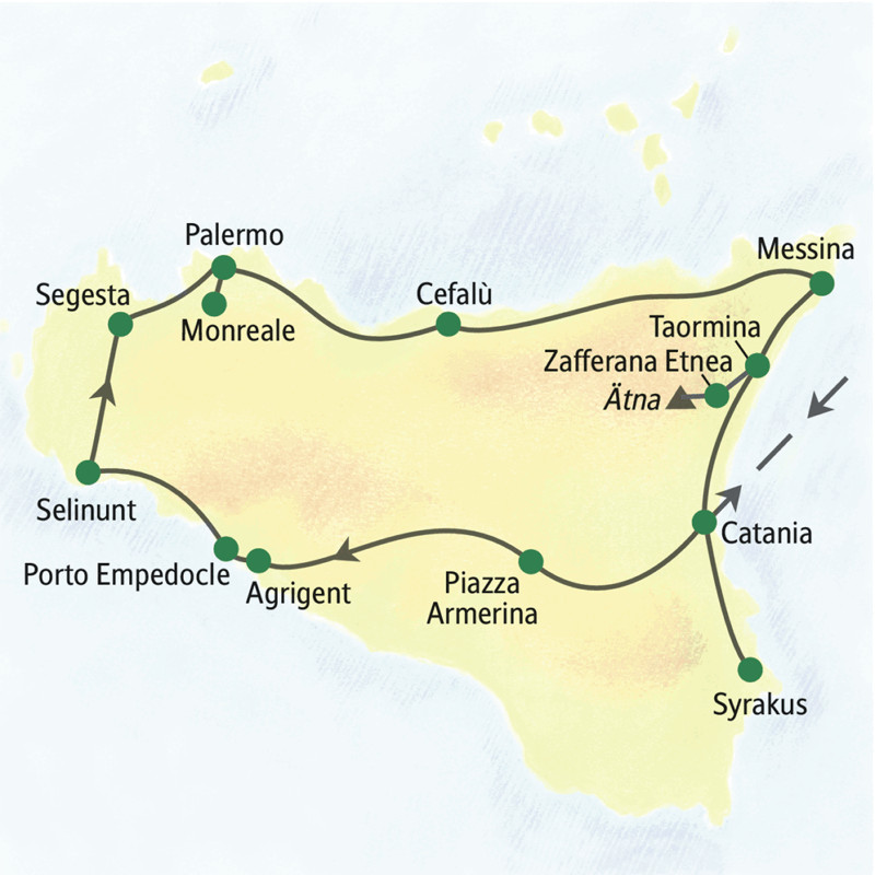 Eine Prise Sizilien gefällig? Dann entdecken Sie mit uns eine Woche lang die größte Insel im Mittelmeer! Auf dem Programm stehen spannende Städte wie Catania und Palermo, die eindrucksvollen Tempel von Agrigent und Segesta, Mosaiken, Ausgrabungen und viel Meer. Wer Vulkane liebt, wird heiß auf den Ätna sein. Wer tolle Blicke liebt, wird Taormina schätzen. Als vorbereitende Maßnahme sehr zu empfehlen: "Der Sizilianer" von Mario Puzo oder einen Commissario-Montalbano-Krimi lesen. Dann wissen Sie, was auf Sie zukommt!