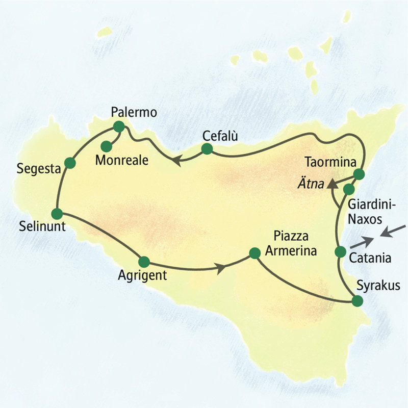 "Italien ohne Sizilien macht gar kein Bild in der Seele: hier erst ist der Schlüssel zu allem", schwärmte schon Goethe. In der Tat war die Insel der ideale Umschlagplatz für alle Völker, die im Mittelmeerraum siedelten. Phönizier, Griechen, Araber, Normannen, ein "schwäbischer" Kaiser ... Alle haben von der fruchtbaren Landschaft profitiert und diese in einer Vielfalt geprägt, wie sie nur selten zu finden ist. Während dieser geruhsamen Studiosus-Reise wechseln sich bekannte kulturelle Höhepunkte mit überraschenden Geheimtipps ab. Freundliche Gastgeber bringen uns sizilianische Lebensart und lokale Spezialitäten näher - und es bleibt viel Zeit, im Hotelpool oder im Straßencafé zu entspannen.