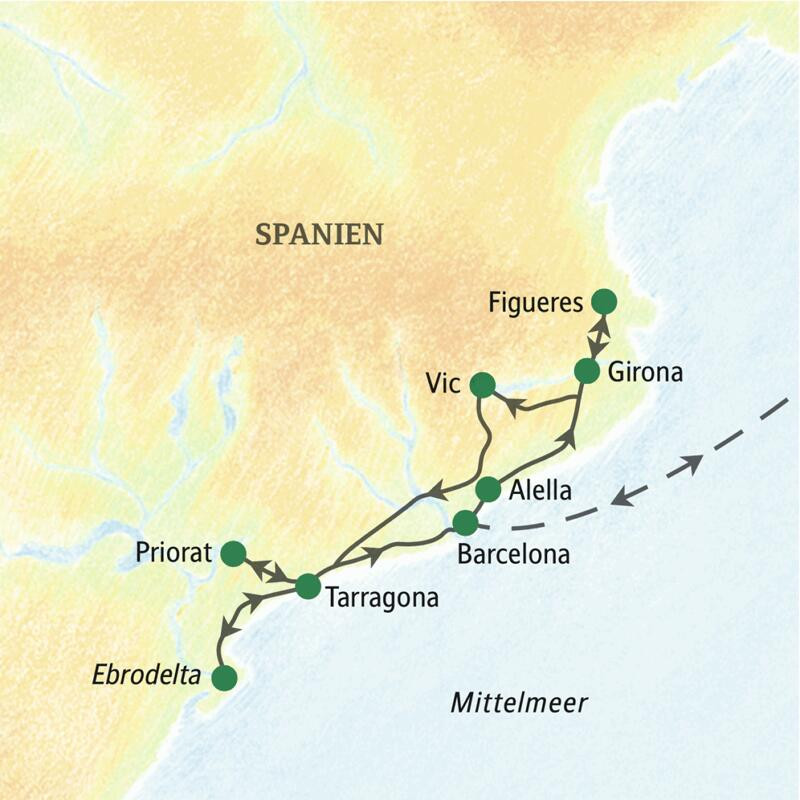 Schlemmen Sie sich auf dieser Reise durch das ländliche Katalonien. Wir genießen raffinierte Fischgerichte am Meer, probieren Wein und Cava in verschiedenen Bodegas, verkosten Olivenöl und Käse in der Priorat-Region und Paella im Ebrodelta. Dabei begegnen wir Menschen, die ihr Leben dem Genuss verschrieben haben. In Girona spazieren wir auf der begehbaren Stadtmauer und werfen einen Blick in die Kathedrale, und in Figueres wandeln wir auf den Spuren Dalís. Abends kehren wir in unsere komfortablen Standorthotels zurück – eine abwechslungsreiche Reise (fast) ohne Kofferpacken.