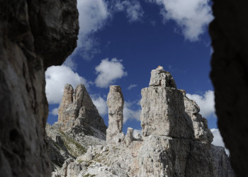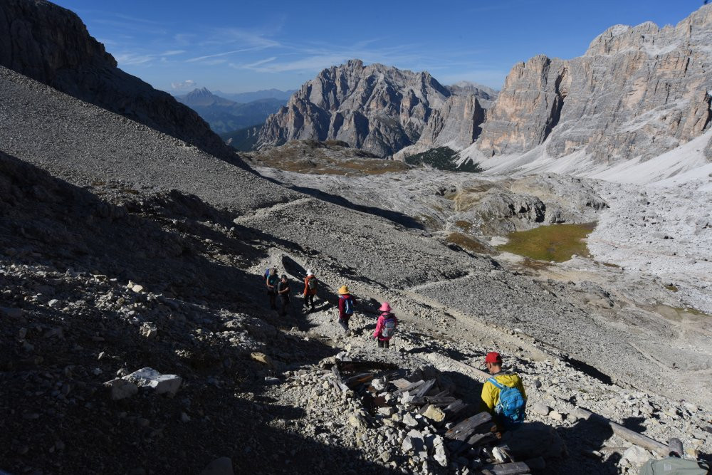 Wir wandern in der Morgensonne gemütlich über schier unendliche blühende Almwiesen. Eine erste Einkehrmöglichkeit bietet sich in dem futuristisch anmutenden und doch mit traditionellen Elementen stilvoll gestalteten Berghaus Pralongia. Entspannt queren wir unterhalb des Settsass-Gipfels hinüber zum Passo Valparola, wo wir uns für den letzten Teil des Tages nochmal ordentlich stärken. Ab hier werden wir für den Rest unserer Wanderwoche immer wieder auf Relikte der im Ersten Weltkrieg erbittert umkämpften Frontline stoßen. Ein erster Aufschwung bringt uns hinüber auf die Hochfläche nördlich des Lagazuoi und damit zu den Resten ehemaliger Österreichischer Stellungen. Beim letzten steilen Gipfelaufschwung laufen wir den ehemaligen Grenzkamm entlang und passieren einige restaurierte Schützenstellungen. Von oben wurden hier einst die Italiener unter Beschuss genommen. Völlig absurd wirkt diese Vorstellung heute im Touristenrummel, der uns oben an der Seibahnstation erwartet. Abends kehrt jedoch Ruhe ein. Wir genießen die hervorragende Küche unserer höchsten Übernachtung auf 2752m und machen nach dem Abendessen noch einen kurzen Spaziergang hinüber zum Gipfel des Kleinen Lagazuoi. Ein Traum, auf diesem Panoramaplatz die Nacht verbringen zu dürfen...