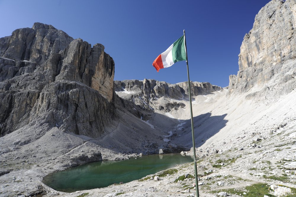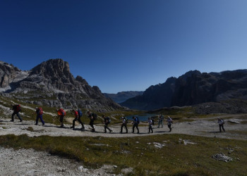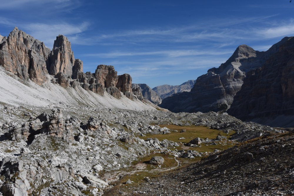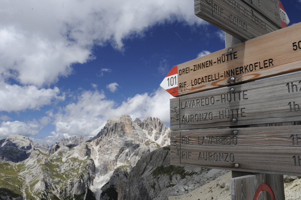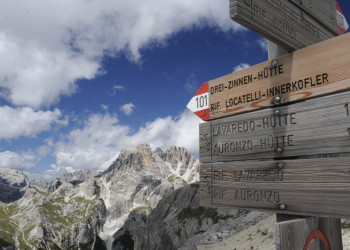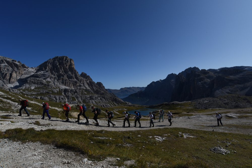 Heute verlassen wir einen besonderen Ort. Das Plateau des Monte Piano war einst zweigeteilt zwischen Österreich und Italien. Im Alpenkrieg von 1914-1918 fanden hier heftige Kämpfe statt. Das Gipfelplateau einschließlich unseres Nachtquartiers ist heute ein eindrucksvolles Freilichtmuseum. Nachdem wir gestern schon einen Eindruck davon bekommen konnten, wandern wir heute auf Kriegswegen entlang der Stellungen auf der Ostseite weiter und dann über den Steilabbruch hinunter zur Malga Rinbianco. Nach dem Aufstieg zum Col de Mèdo lassen wir es uns bei unserer Mittagsrast auf der Langalm direkt vor den majestätischen Drei Zinnen gut gehen. Eine Gruppe junger Leute haben die kleine Alm im traditionellen Stil vor wenigen Jahren wieder neu errichtet und bieten uns eine hervorragende regionale Küche. Den ganzen Tag haben wir die mächtigen Drei Zinnen unmittelbar vor uns. An der Drei-Zinnen-Hütte und den Bödenseen vorbei wandern wir für eine letzte Einkehr zu der kleinen aber feinen Büllelejochhütte. Ein kurzer Abstieg führt uns dann hinunter zur Zsigmondy Hütte im Herzen der Sextener Dolomiten.