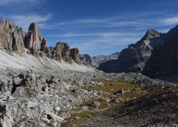 Ein langer Tag steht uns bevor. Den mächtigen Langkofel im Blick, steigen wir über Almwiesen zuerst bergab. Oberhalb des Grödnertals queren wir hinein in das Val de Chedul, ein kleines, einsames Seitental, das uns hinauf führt auf die Forcella de Cier. Hinter uns ragen noch die Spitzen der Geislergruppe in den Himmel, während wir vor uns den massiven Block der Sella erblicken. Ein kurzer steiler Abstieg führt uns zur Jimmi-Hütte, wo wir die Mittagsrast bei hervorragender Südtiroler Küche genießen. Gestärkt geht es noch ein kurzes Stück bergab zum Grödner Joch. Auf der anderen Seite des bei Motorradfahrern beliebten Übergangs führt der Weg zuerst flach auf einem Felsband an den Sellastock heran, bevor er plötzlich in eine enge felsige Rinne einbiegt, die uns steil hinauf führt zu einem wahren Juwel der Dolomiten: dem Lago de Pisciadù. Bei sommerlichem Wetter lädt er nach dem anstrengenden Aufstieg zu einem kühlen Bad in 2570m Höhe ein, bevor wir an seinem Ufer unser gemütliches Nachtquartier in der Pisciadù-Hütte beziehen. Nur die Sterne sind zu sehen an diesem Ort der Stille, eingebettet zwischen den hohen Gipfeln der Sella-Gruppe.