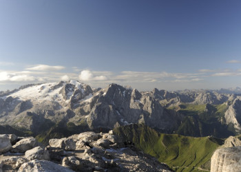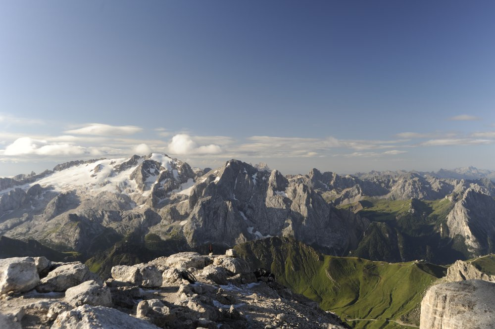 Am Westufer unseres gestrigen Badesees entlang starten wir unter den Wänden des Sas da Lech steil hinauf und erreichen an der Sela di Pisciadù die steinige Hochfläche der Sella. Vorbei am Rifugio Boè geht es hinauf zu unserem höchsten Punkt, dem Piz Boè. Hier auf 3152m genießen wir auf der Terasse des winzigen Rifugio Capanna Piz Fassa bei feiner landestypischer Küche einen großartigen Rundumblick. Kaum ein Gipfel überragt uns und der Blick fällt im Norden vom Alpenhauptkamm nach Süden über die Marmolata bis zu den letzten Erhebungen der Alpen. Über den Lichtenfelser Weg gelangen wir über weitere Gipfel hinunter zur Franz-Kostner-Hütte und blicken beim Bad im Lech de Boè nochmal zurück in die steilen Westwände der Sella, die wir nun hinter uns lassen. Unglaublich, dass wir einen gangbaren Weg hier hindurch gefunden haben. Auf gemütlichen Almwegen wandern wir hinunter zum Passo di Campolongo und zu unserem komfortablen Quartier, Hotel Laguscei.