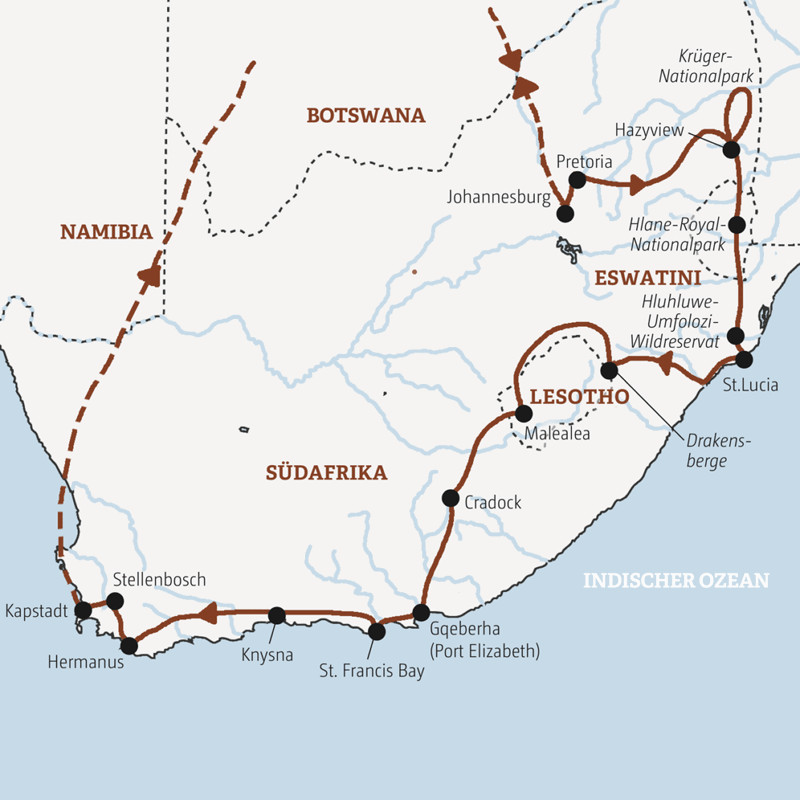 Wildlife und Easy Living, Rundhütten und die Sandstrände der Garden Route - zwischen Johannesburg und Kapstadt findet man den Kontinent Afrika in einem Land! Und in nur 20 Tagen alles, was Südafrika und seine Satelliten Eswatini und Lesotho zu bieten haben: ursprüngliche Natur, reiche Traditionen und freundliche Menschen. Wir erkunden das Kap der Guten Hoffnung, folgen im Krügerpark den Spuren der Löwen und Elefanten, riechen den Duft der Savanne und genießen Abende am Grillfeuer vor unseren typisch südafrikanischen Lodges!