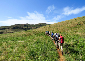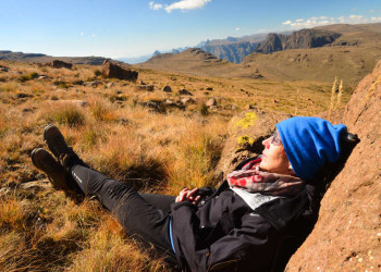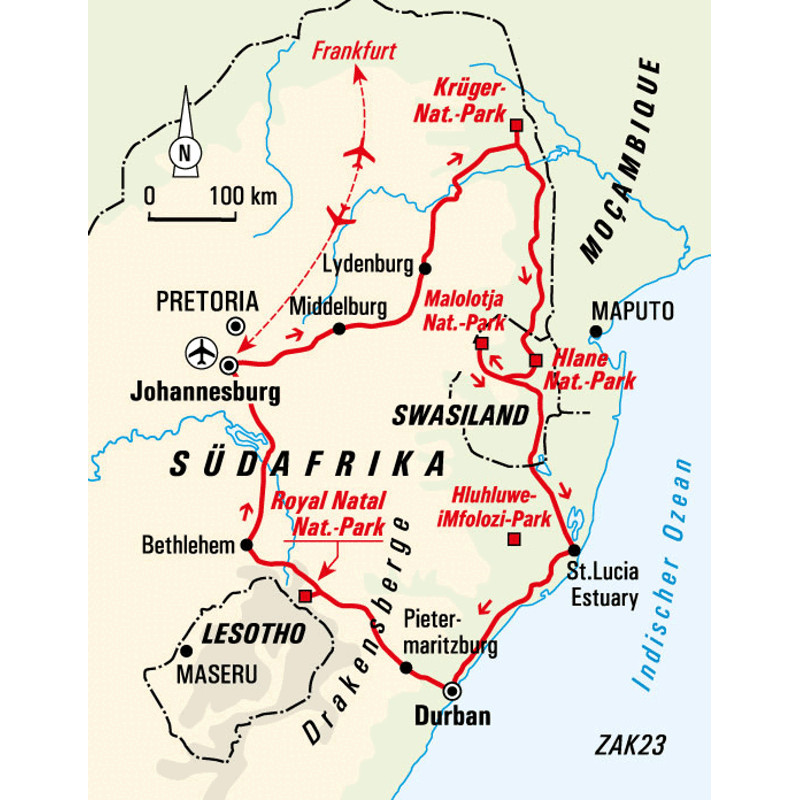 Wander- und Safarireise durch Krüger-, Hlane- und Hluhluwe-NP, den iSimangaliso Wetland Park und die DrakensbergeBehutsam pirschen wir durch das hüfthohe, trockene Gras und Gestrüpp. Wir folgen unserem Spurenleser und halten Ausschau nach den Big Five. Jede Bewegung im Gebüsch lässt unseren Atem kurz stocken. Plötzlich ein Handzeichen und wir sehen den Rücken eines Nashorns aus den Gräsern auftauchen. Ganz nah dran an diesen grauen Kolossen, ein unvergesslicher Moment. Mit einem Ranger wandern wir am Rande der Krüger- und Hluhluwe-Nationalparks. Zu Fuß und auf Augenhöhe mit der afrikanischen Tierwelt: Tierbeobachtungen, Fährten lesen und Nervenkitzel inklusive. Wir hören den Elefanten zwischen den Mopane-Bäumen beim Trompeten zu und lernen die Pflanzenwelt des südafrikanischen Buschs sowie seine vielfältigen Vogelarten kennen. Im offenen Geländewagen gehen wir auf Großwild-Pirsch: dem Löwen auf der Spur, Auge in Auge mit einem Büffel und auf Streifzug mit Zebras und Antilopen. Im Anschluss erwarten uns Wanderungen in Eswatini sowie die nördliche Küste Südafrikas am Indischen Ozean. Bei einer Bootsfahrt auf dem Lake St. Lucia im iSimangaliso Wetland Park entdecken wir Flusspferde, Krokodile und lauschen dem Ruf des Schreiseeadlers. Zum Grande Finale erkunden wir die majestätischen Drakensberge: die markanten Silhouetten von Mont aux Sources und Sentinel, die mächtigen Tugela Fälle und die erhabene Steilwand des Amphitheaters. Nach steilen Felsklippen, hügeliger Waldlandschaft und erfrischenden Wasserfällen liegt uns im Royal Natal-Nationalpark Südafrika zu Füßen.