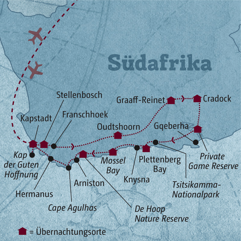 Die Idee dieser Selbstfahrer-Reise: Südafrika ohne Malariarisiko entdecken. Ausreichend Zeit für die Naturwunder an und abseits der klassischen Garden Route. Der Vorschlag unserer Länderexpertin führt Sie u. a. zu den einsamen Stränden im De-Hoop-Naturschutzgebiet und zu den Big Five in einem privaten Wildreservat. Keine Sorge, das "Tal der Trostlosigkeit" ist alles andere als trostlos! Die schroffen Felsen, die aus der staubigen HALBWÜSTE KAROO ragen, sind die perfekte Kulisse für jeden Wildwestfilm. Welch ein Kontrast dazu die strahlend weißen Dünen und das tiefblaue Meer im DE-HOOP-NATURSCHUTZGEBIET. Sie klettern auf eine Düne – WHALE-WATCHING vom Strand aus. Schon nach wenigen Minuten taucht die riesige Schwanzflosse eines Buckelwals auf. Am Ende der Reise mein persönliches Highlight: KAPSTADT. Packen Sie einen Picknickkorb und wandern Sie auf den Lion's Head. Besonders schön ist der 360-Grad-Blick bei Sonnenuntergang.
