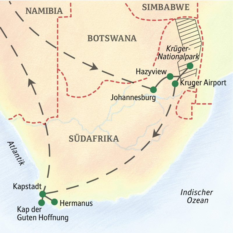 - 11 Übernachtungen in guten Hotels mit Klimaanlage und Swimmingpool (außer Hermanus)