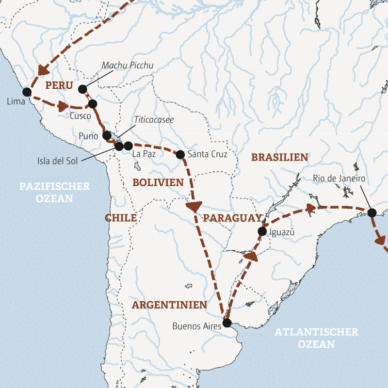 Von A bis Z – von den Anden bis zum Zuckerhut! In Lima, der kulinarischen Hauptstadt des Kontinents, schlemmen, den Sonnenuntergang am Titicacasee genießen, sich im Rhythmus des Tangos durch Buenos Aires wiegen und in Rio Copacabana-Flair atmen. Immer im Gepäck – das Abenteuer und eine Prise Nervenkitzel: durch Schluchten und Täler zu den Inkastätten der Anden, mit der Seilbahn über La Paz schweben und schließlich die Gischt der tosenden Wasserfälle von Iguazú auf der Haut spüren.