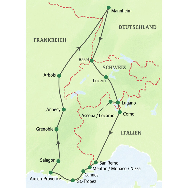 In 15 Tagen mit Studiosus-Reiseleiter in die Schweiz, nach Italien und Südfrankreich im Komfortbus ab Mannheim