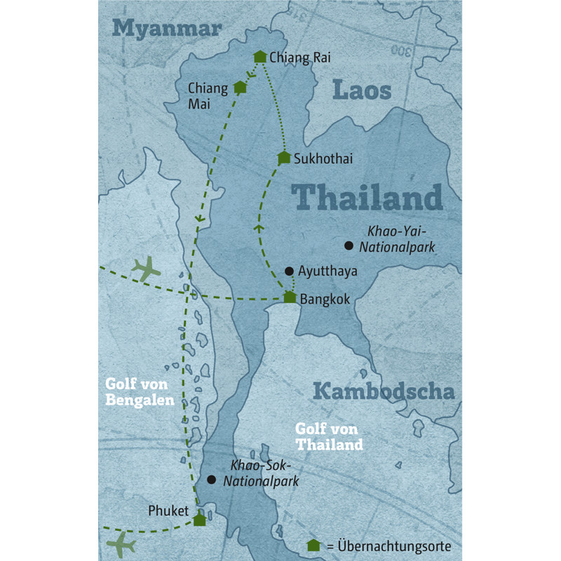 Die Idee dieser Reise: Thailand in all seinen Facetten kennenlernen. Auf der vorgeschlagenen Route unserer Länderexpertin liegen u. a. Bangkok, Chiang Mai und das Goldene Dreieck, aber auch die alte Khmer-Hauptstadt Sukhothai und die Stadt Lampang. Ein paar Strandtage in Phuket sind der perfekte Ausklang. Fragen Sie Ihren einheimischen Scout, auf welchem Wolkenkratzer sich die angesagten Open-Air-Bars befinden. Besonders abends lohnt sich ein Blick auf BANGKOK von oben! Lassen Sie sich im Privatwagen durch das Land chauffieren. Überall saftig grüne REISFELDER. Die weißen Körner bedeuten hier Leben. Kein Wunder, dass "eine Mahlzeit einnehmen" auf Thai wörtlich "Reis essen" heißt. Mein persönliches Highlight ist der WAT DOI SUTHEP in CHIANG MAI, spiritueller Treffpunkt buddhistischer Pilger. Klettern Sie 306 Stufen hinauf, der Weg gesäumt von Nagas und Drachen. Hier können Sie einfach die Seele baumeln lassen und das Panorama genießen.