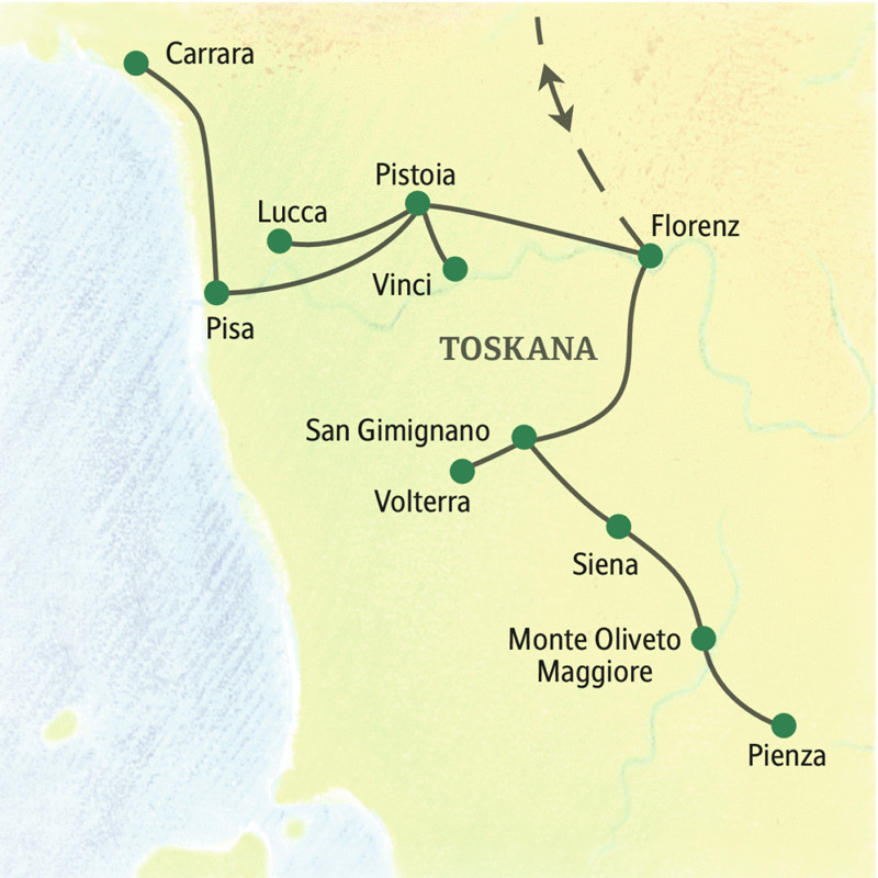 Der berühmte Silberaltar in Pistoia, der Barockgarten bei Lucca, Erfindungen von Leonardo da Vinci, Gemälde von Michelangelo und Botticelli - Meisterwerke wie diese und viele weitere lernen Sie auf unserer Studiosus-Reise in die Toskana kennen. Sie wohnen in zwei kleinen, zauberhaften Hotels, sind bei einem Biobauern zu Gast und haben auch Zeit, sich selbst ein Bild zu machen von den verborgenen und weltberühmten Schätzen, die zur Toskana gehören wie die Zypressen in der unverwechselbaren Hügellandschaft. Und haben Sie dann auch noch die Höhepunkte der wichtigsten Städte gesehen - Florenz, Lucca, Pisa, San Gimignano und Siena -, wird eine Collage für alle Sinne daraus, die Sie im Herzen mit nach Hause nehmen.