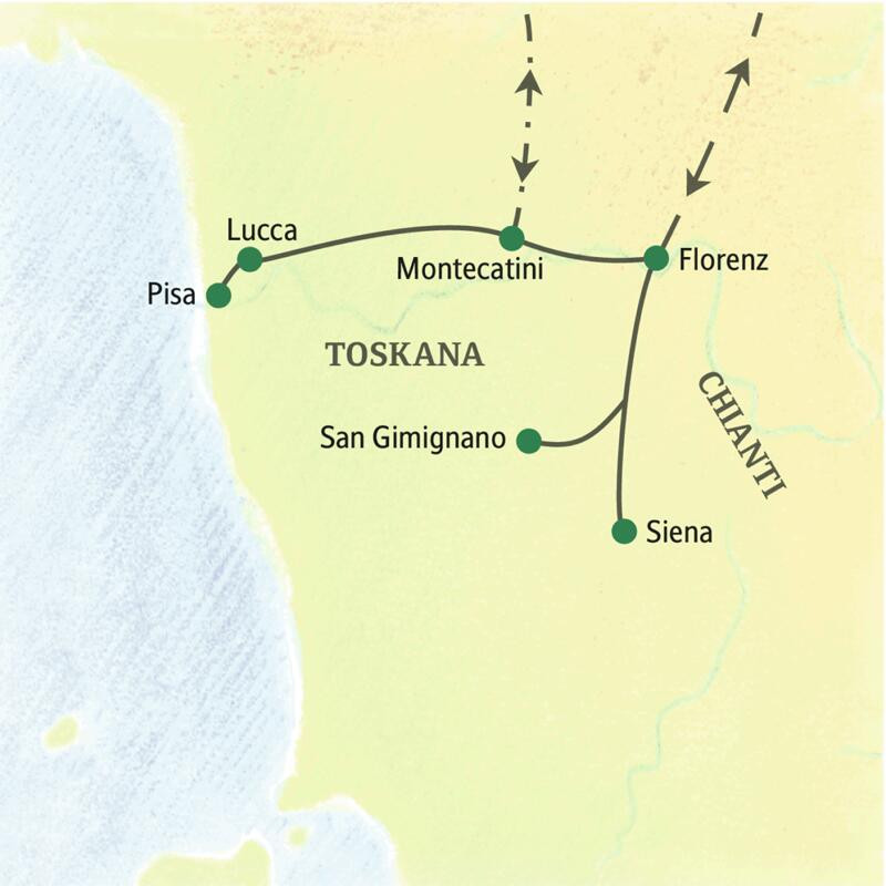 Sanfte Hügel, mittelalterliche Palazzi, Domkuppeln, Türme und stilvolle Landhäuser inmitten von Zypressen – gäbe es die Postkarte nicht, man müsste sie allein für diese Motive erfinden. Noch mehr lohnt es sich, die Toskana live zu erleben und in eigenen Bildern und Aromen einzufangen. Von einem Hotel im hübschen Thermalort Montecatini aus erkunden wir auf dieser Studiosus-Reise die Höhepunkte der Region: San Gimignano, Pisa, Lucca, Siena und natürlich Florenz. Immer wieder haben Sie Zeit für sich, zum Relaxen, Spazierengehen, Shoppen und Stöbern. Manche Ausflüge machen wir per Zug, und das bedeutet: Sie können zurückfahren, wann immer Sie Lust haben. Oder einfach bleiben, bis die letzte Bahn fährt.
