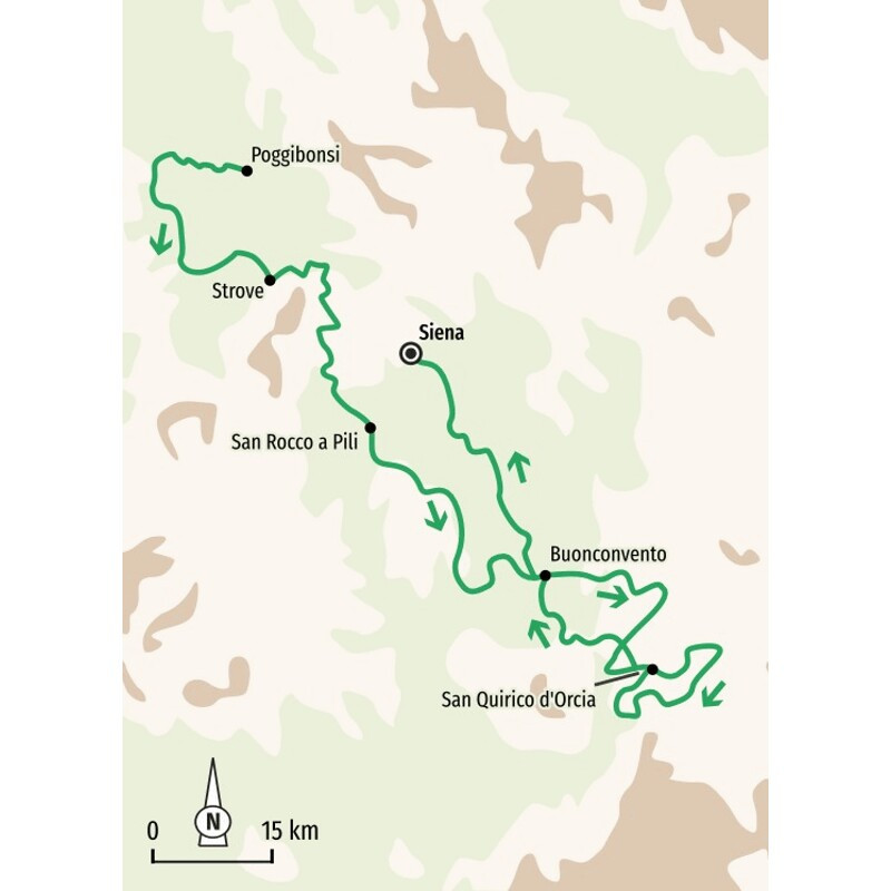 Radreise mit MTB oder E-MTB von Poggibonsi über Pienza nach SienaLassen Sie sich auf dieser Radreise durch die schönsten Ecken der Toskana inspirieren von einer malerischen Hügellandschaft mit Weingärten, Zypressen und Lavendelfeldern. Auf einsamen hügeligen Landstraßen und anspruchsvollen Waldpfaden entdecken Sie Bergdörfer, entlegene Täler und traditionelle Bauernhöfe. Genießen Sie die Magie des mediterranen Lichts, während Sie über alte Pilgerwege radeln. Herzstück der Tour sind wunderschöne Orte wie San Gimignano, Monteriggioni und Pienza, die mit ihren prächtigen Palästen und verwinkelten Gassen zum Flanieren einladen und einen Hauch italienischer Renaissance vermitteln. Erleben Sie italienische Kulinarik und Gastfreundschaft mit toskanischen Spezialitäten und köstlichen Weinen. Willkommen in der Toskana!Sie ziehen auf eigene Faust los und reisen in Ihrem eigenen Tempo. Genießen Sie eine perfekte Kombination aus Unabhängigkeit und einer durchdachten Reiseorganisation im Hintergrund, Ihr Gepäck wird von Unterkunft zu Unterkunft gebracht. Am Ende der Reise bringt Sie ein Transfer zurück nach Poggibonsi.Hinweis: Diese Reise wird im August aufgrund der hohen Temperaturen nicht empfohlen.
