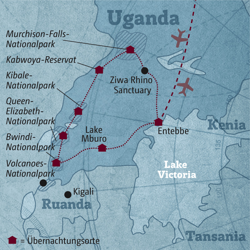Die Idee dieser Reise: die sagenhafte Natur und Tierwelt Ugandas kennenlernen. Der Routenvorschlag unserer Länderexpertin führt Sie in mehrere Nationalparks. Dort begegnen Sie neben den Berggorillas auch den Big Five. Diktator Idi Amin und seine Gewaltherrschaft gehören zum Glück der Vergangenheit an. Seitdem zählt Uganda für mich zu den Traumdestinationen in Afrika. Bei einer Bootsfahrt auf dem KAZINGA-KANAL im QUEEN-ELIZABETH-NATIONALPARK entdecken Sie Krokodile, Elefanten und unzählige Nilpferde. Ein Baumlöwe hält perfekt getarnt Siesta in einem Feigenbaum – gut, dass er den geschulten Augen Ihres Scouts nicht entgeht! Mein persönliches Highlight? Die letzten BERGGORILLAS in freier Wildbahn zu sehen. Das Gorilla-Tracking im BWINDI-NATIONALPARK ist streng reglementiert, deshalb mein Rat: Buchen Sie rechtzeitig!