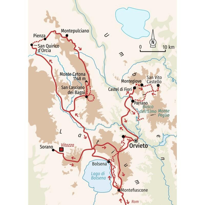 Wanderreise auf den Spuren der Etrusker von der Hochmaremma bis in die grüne Hügellandschaft UmbriensSanft geschwungene Hügellandschaften, mit Zypressen gesäumte Alleen und der zarte Duft von wilden Kräutern in der Luft – auf unseren Wanderungen durch die beiden Regionen Toskana und Umbrien entdecken wir neben bekannteren Orten eine ursprüngliche, stille Seite Italiens, fernab ausgetretener Pfade. Schritt für Schritt tauchen wir tiefer ein in das ursprüngliche Leben der Etrusker und durchqueren auf alten Handelswegen grüne Wälder mit malerischen Ausblicken auf die umliegenden Olivenhaine und Weinberge. Wir wandern durch Gegenden, in denen das antike Volk einst ihre Siedlungen baute – oft auf markanten Höhen, mit Blick über das Land. Noch heute ist ihre Präsenz spürbar, sei es durch archäologische Fundstätten oder durch die besondere Atmosphäre dieser Orte. Auf unserer Reise besuchen wir historische Städte wie Orvieto, Pienza oder Montepulciano. Bei einem Cappuccino in der Sonne genießen wir das italienische Flair und nehmen die Atmosphäre der quirligen Altstädte in uns auf. Am Abend kehren wir gemütlich in kleinen Trattorien ein und lassen uns von lokalen Spezialitäten bei einem Glas Wein aus der Region verwöhnen.