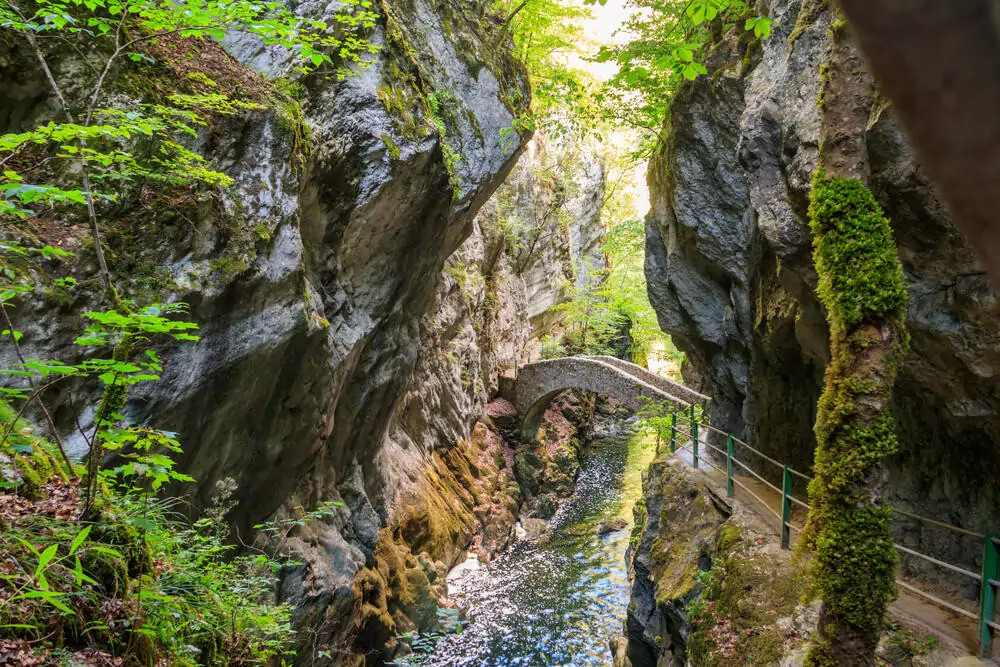 6. Tag: Durch die Areuse-SchluchtNach einer Bahnfahrt über Neuenburg erreichen wir Noiraigue. Von hier aus wandern wir durch die Areuse-Schlucht, begleitet vom mal ruhig fließenden, mal wild rauschenden Fluss. Der Weg führt uns über alte Steinbrücken, hölzerne Stege und gewundene Treppen und schlängelt sich durch enge Felspassagen und eindrucksvolle Felsformationen – ein grandioses Naturerlebnis! Rückfahrt nach Murten (GZ: 4 Std., + 50 m, - 300 m).