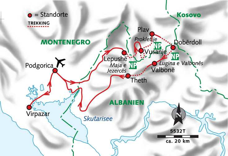 So wohnen wirIn Lëpushë, Vusanje und Theth erfolgen die Übernachtungen in familiären, einfachen Gästehäusern. In Dobërdoll wohnen wir in einer Berghütte. In Plav und Valbona nächtigen wir in einem Mittelklassehotel und in Podgorica im Vier-Sterne-Hotel. In Lëpushë und Dobërdoll bewohnen wir Mehrbettzimmer mit Gemeinschaftsdusche/WC, ansonsten Doppel- oder Einzelzimmer mit Bad oder Dusche/WC (Ü = Übernachtung).