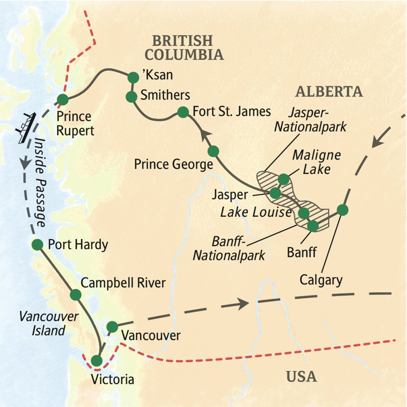 Folgen Sie dem Ruf der Wildnis und kommen Sie mit uns nach Westkanada, wo alles größer, höher, weiter, erhabener ist! Die Natur prunkt mit zahllosen rauschenden Flüssen, stillen Seen und schier undurchdringlichen Wäldern. Wir tanken Energie in den majestätischen Rocky Mountains und bei einer Fahrt durch die einsamen Fjorde der Inside Passage. Auch in den für uns Europäer jungen Städten herrschen ganz andere Dimensionen. Ein Spielplatz für moderne Architekten und Designer. Tief berührt uns der Kontakt mit Kultur und Lebensweise der indigenen Einwohner.