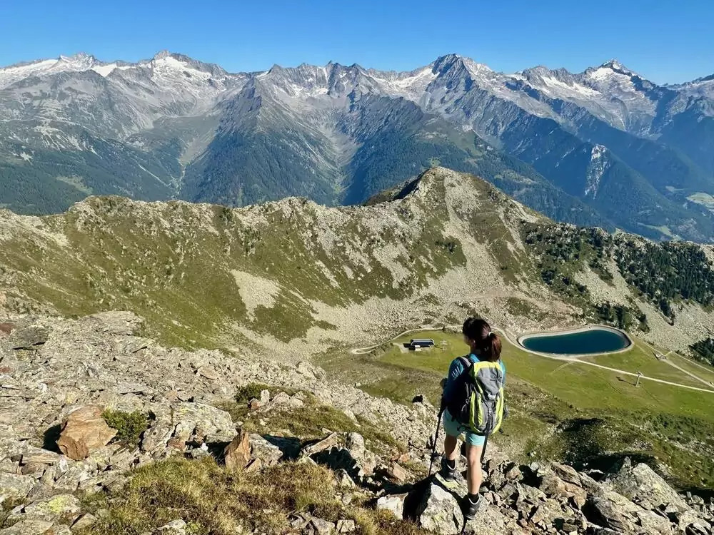 4. Tag: Zum schönsten Aussichtsgipfel der ZillertalerMit der Klausbergbahn schweben wir auf 1.600 m und wandern zum türkis schimmernden Klaussee. Oberhalb von ihm ragt schon der Rauchkofel in den blauen Himmel. Der Aufstieg durch die Klausenscharte fordert nochmal Kraft, aber oben ist alles vergessen: Vor uns breitet sich ein Panorama wie ein Gemälde aus – Zillertaler Alpen, Rieserfernergruppe, Dolomiten, Pfunderer Berge. Unter uns glitzern Klaussee, Schloßbergsee und Schreinsee in der Sonne. Über die Pojerspitz geht es zur Seilbahnstation zurück (GZ: 6 Std., +/- 1.100 m).